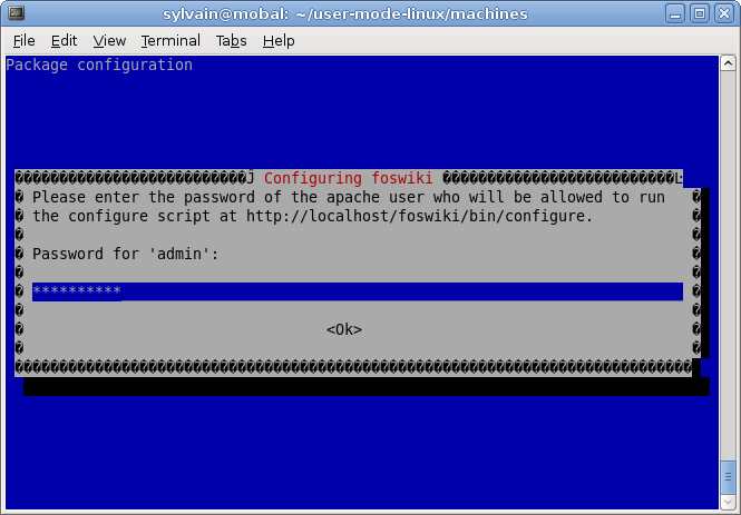Configurer le mot de passe à l'installation de Foswiki — Enfin, il va être nécessaire de fournir le mot de passe de l'administrateur de Foswiki. Vous allez définir ce mot de passe à cette étape. Cet utilisateur n'existe que dans Foswiki et n'a pas à correspondre à un utilisateur du système.