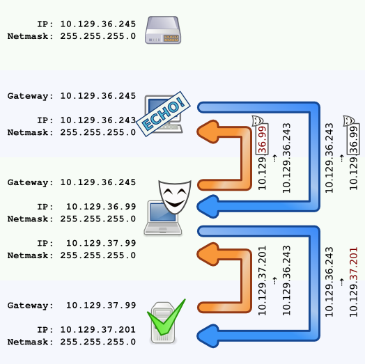 Une solution est d'utiliser une technique de mascarade (masquerading), pour cacher les adresses IP fixes de mes machines virtuelles derrière l'adresse IP de l'hôte sur le réseau physique. De cette manière, vu du réseau physique, tous les paquets qui sortiront de mon portable porteront son adresse IP. En supposant que le réseau physique qui m'accueille soit bien configuré, je pourrai donc recevoir les réponses. Et quand mon portable recevra ces réponses, l'opération de mascarade sera inversée, et l'hôte fera suivre (on retrouve ici le forwarding) les paquets à leur destinataire virtuel.